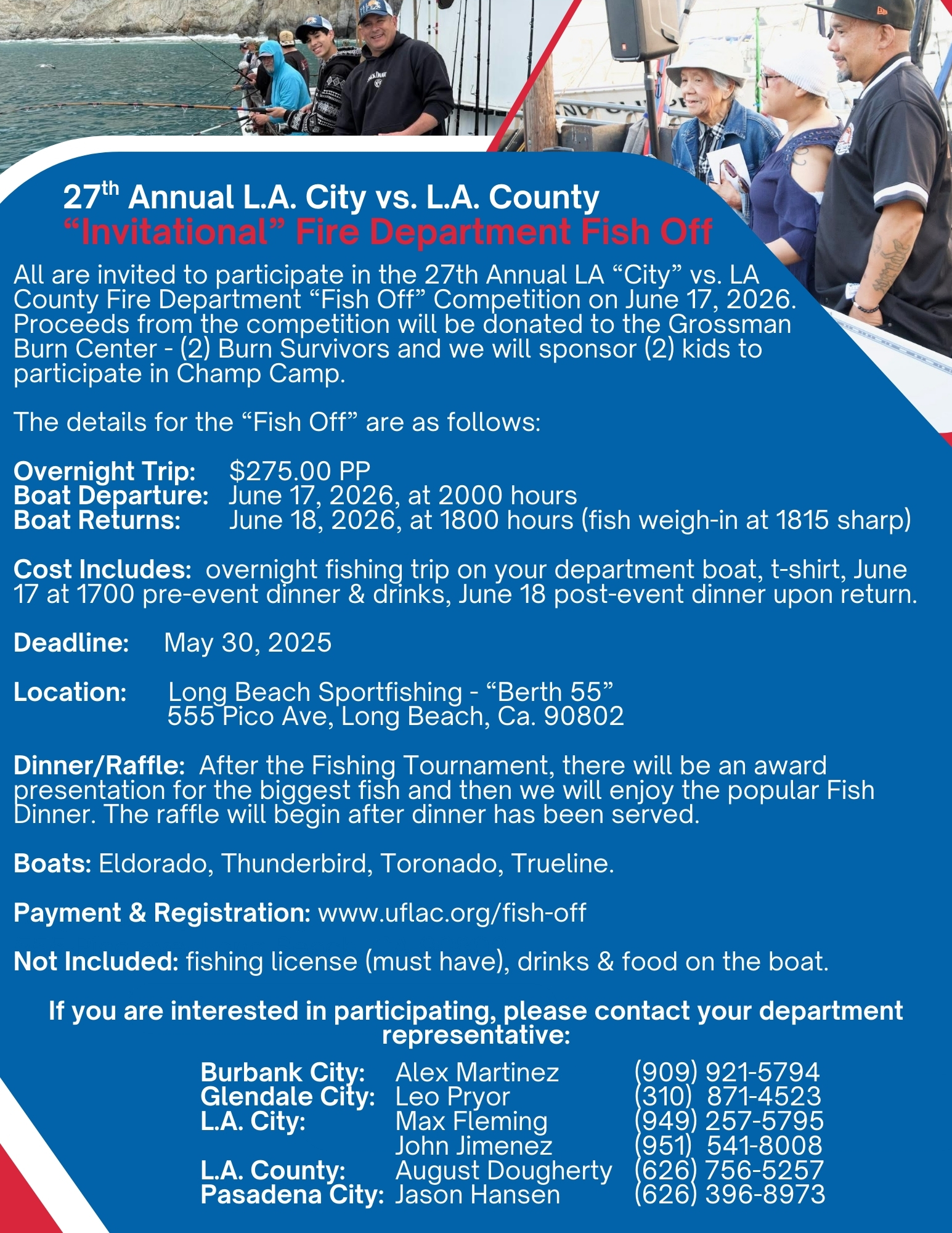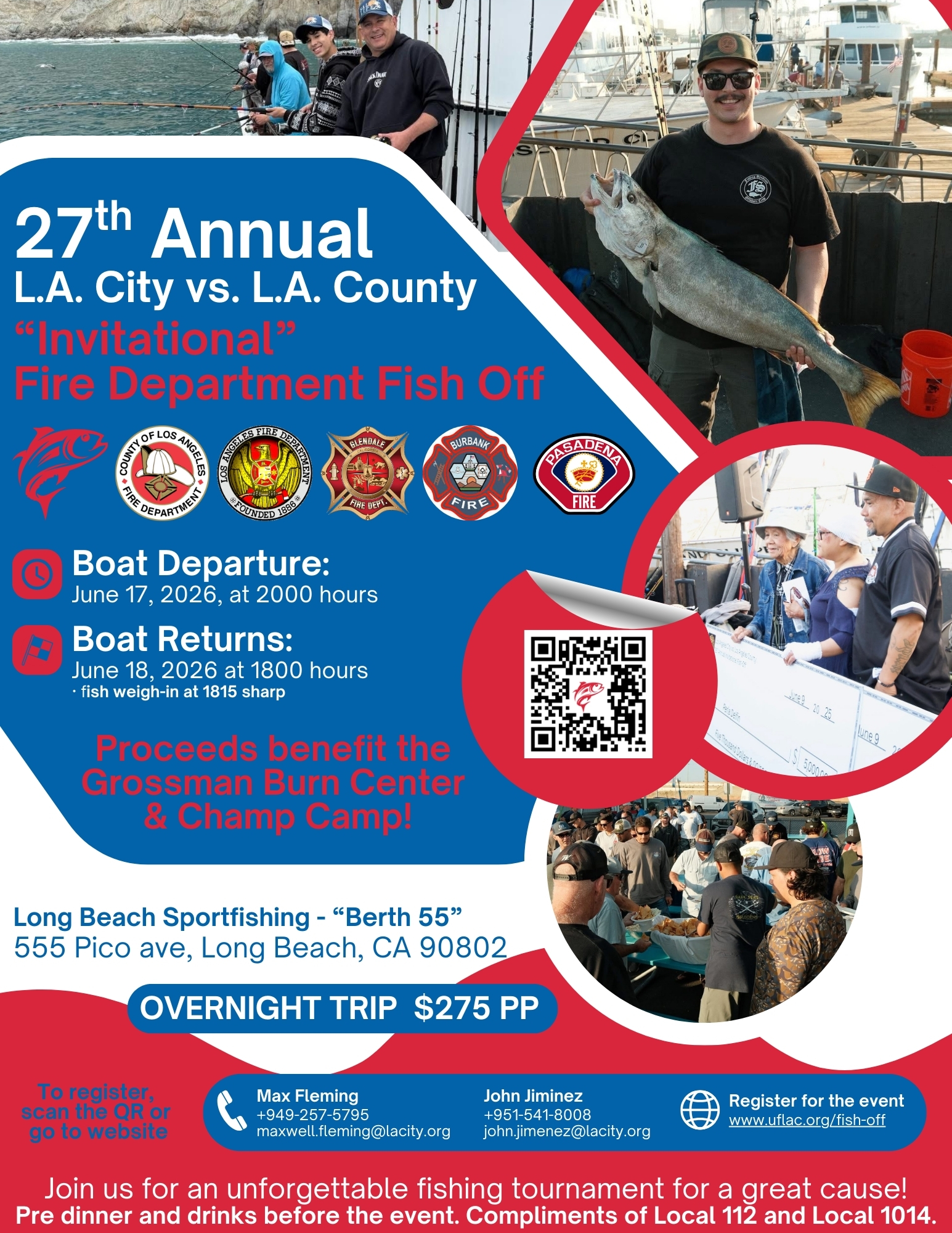All are invited to participate in the 27th Annual LA “City” vs. LA County Fire Department “Fish Off” Competition on June 17, 2026. Proceeds from the competition will be donated to the Grossman Burn Center – (2) Burn Survivors and we will sponsor (2) kids to participate in Champ Camp.